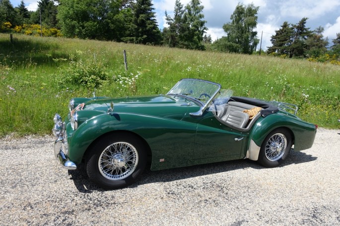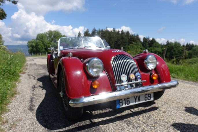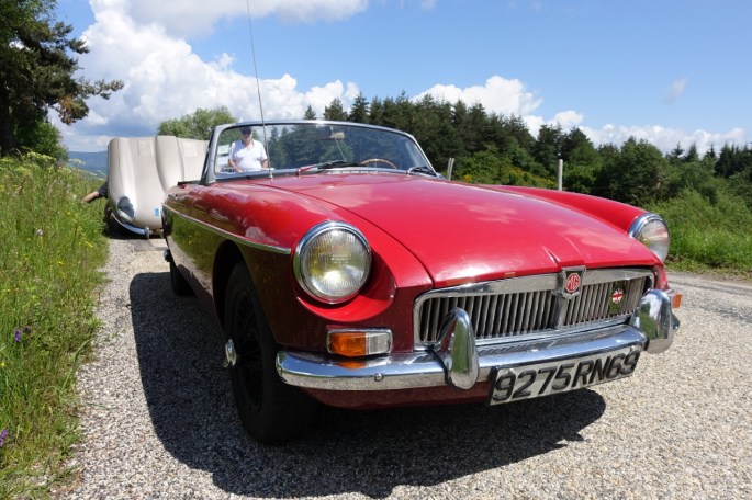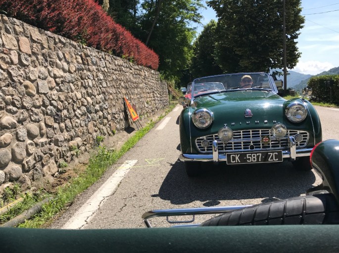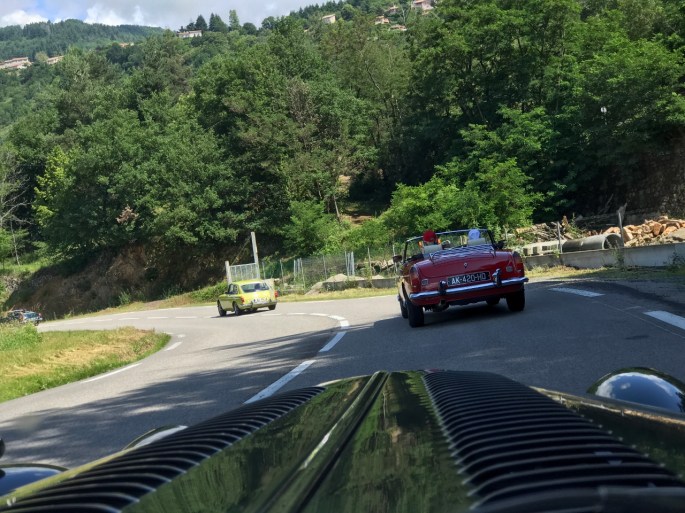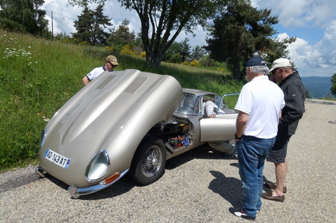Mais avant ceci à nous les belles routes ardéchoises. Rendez vous à Tournon avec une boisson au café « Morgan », il fallait l’inventer! Les virages et les beaux paysages s’enchainent en direction d’Antraigues, via Lamastre et Le Cheylard. Dans la montée du col du Vaset atelier bricolage et recherche d’eau pour réparer une durite sur la type-E de Paul, sans conséquence heureusement pour le reste du parcours.