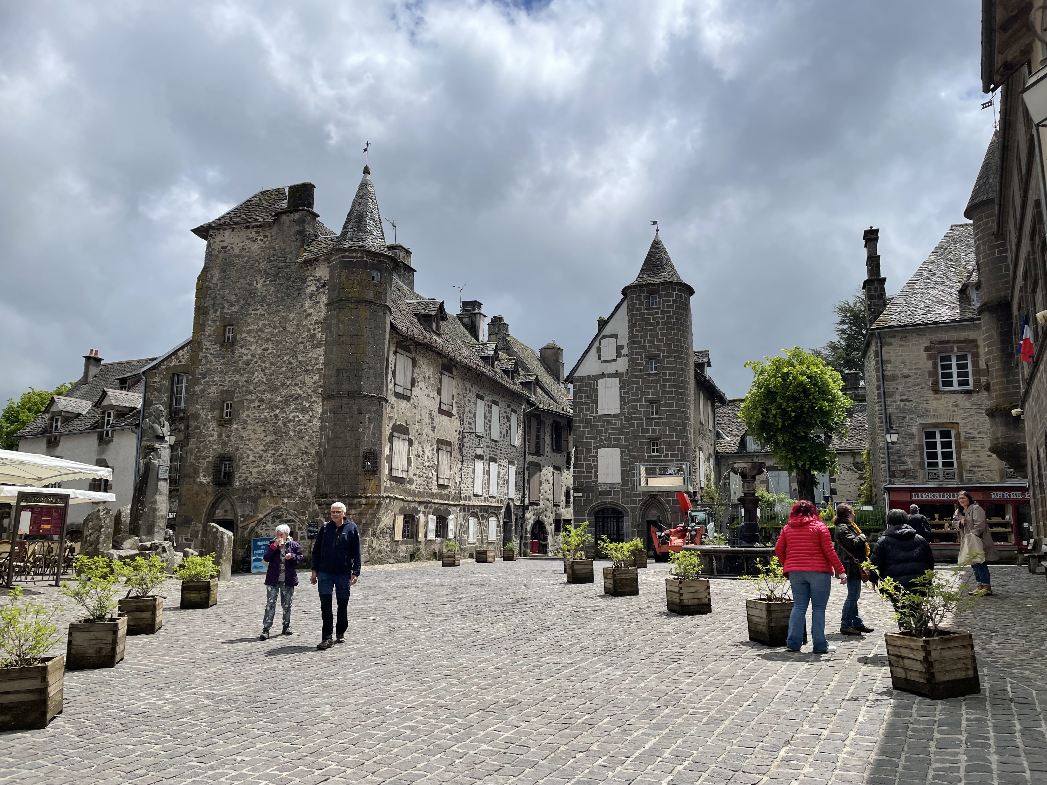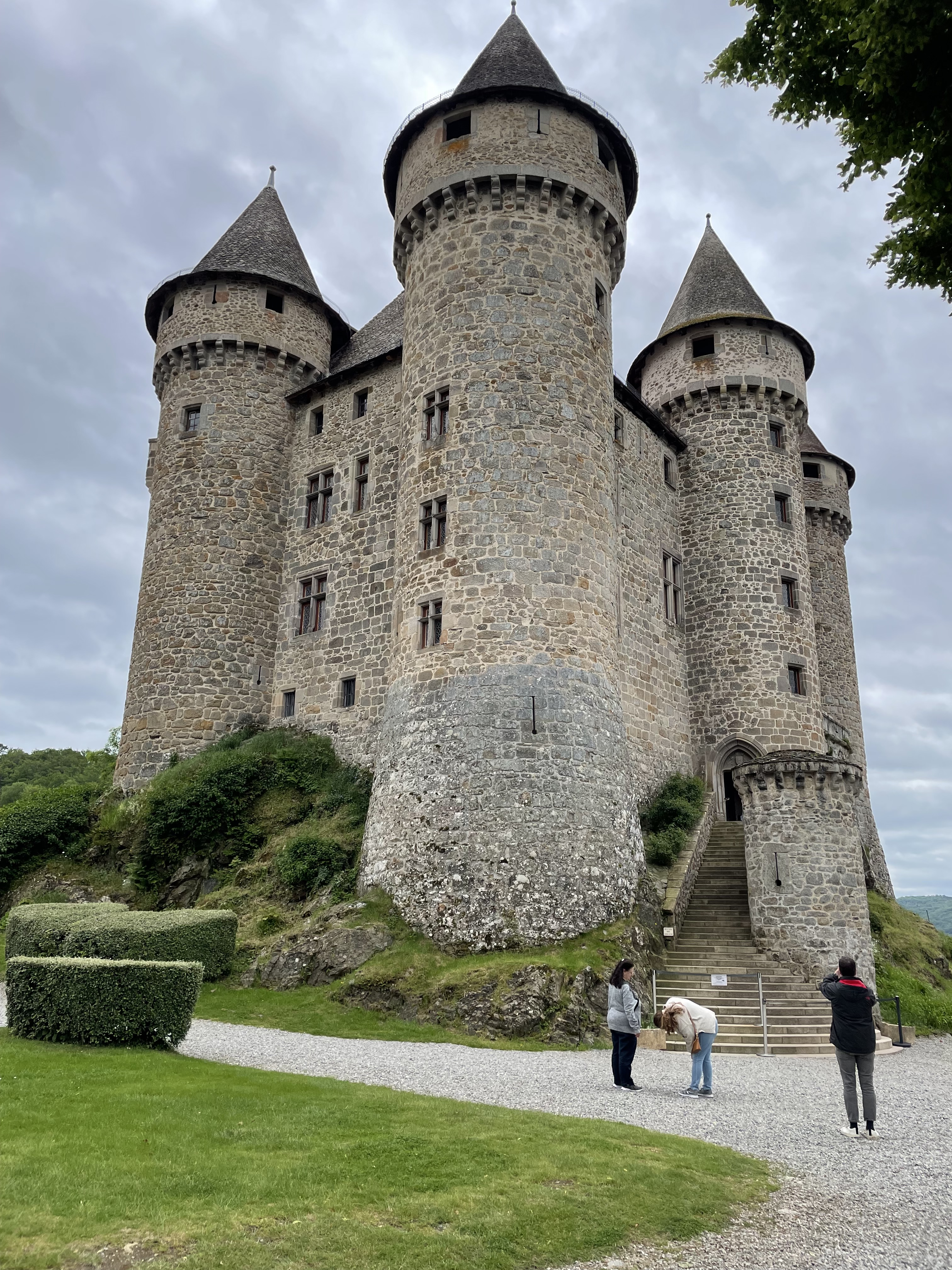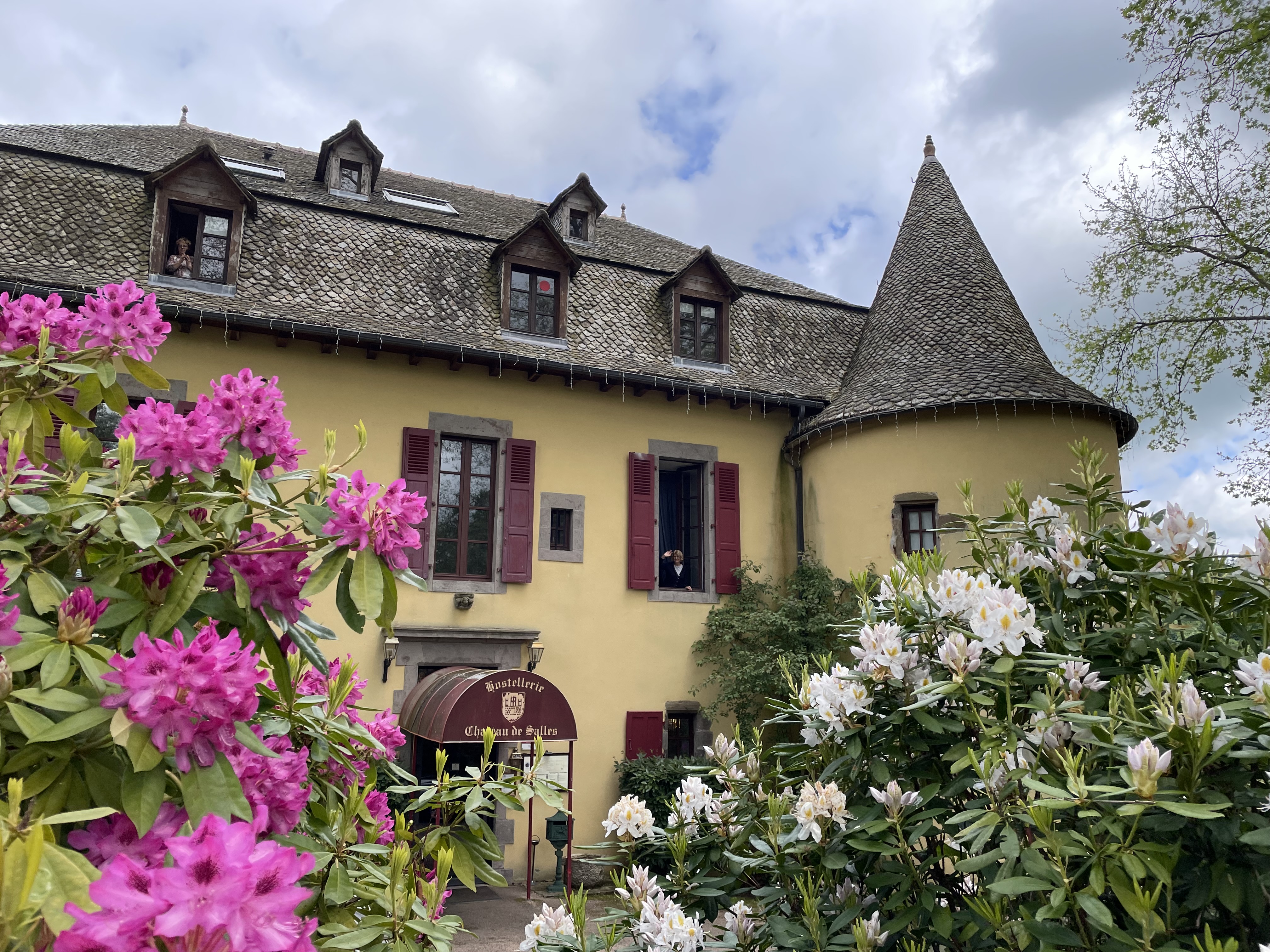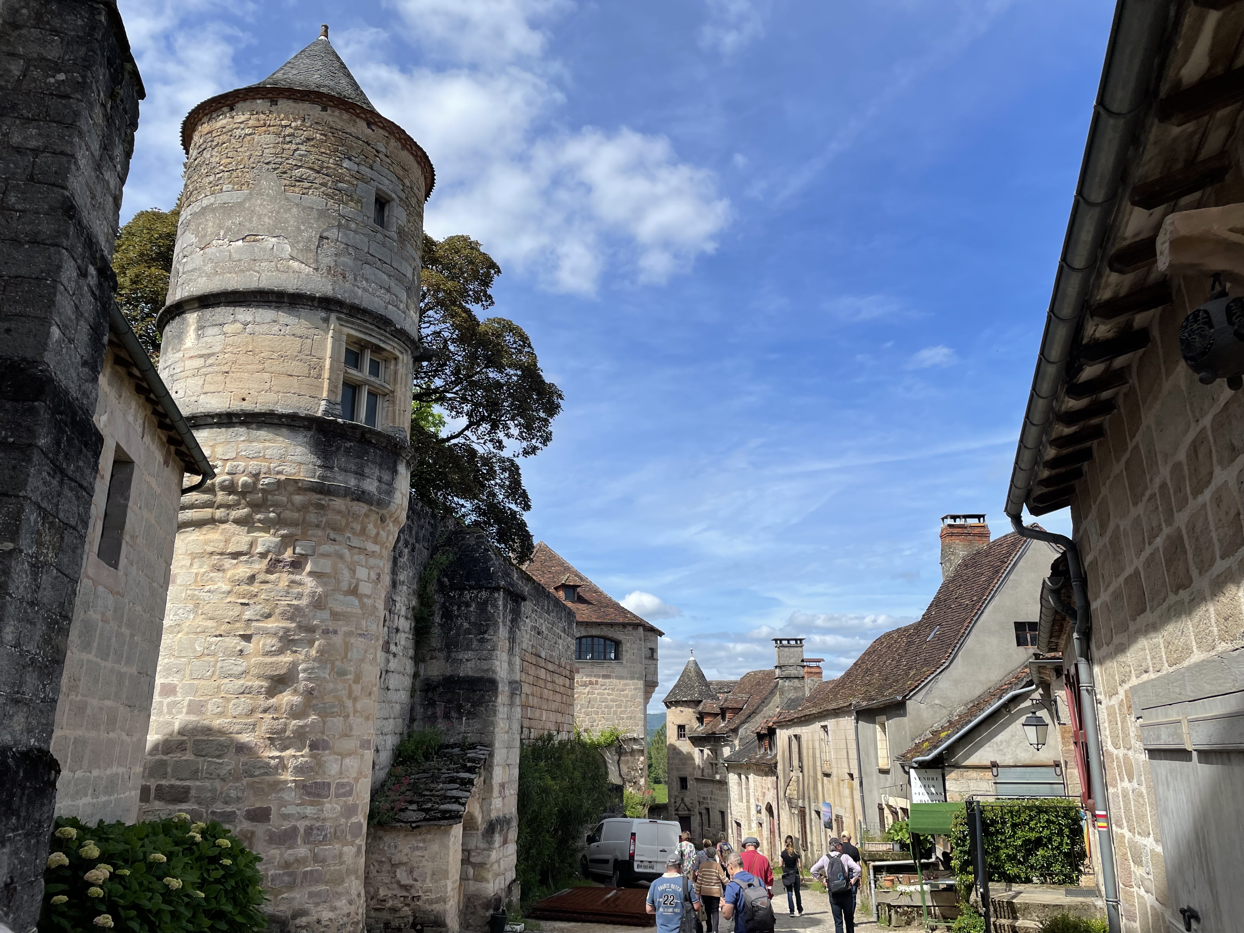 Jeudi 30 – La route des fromages. Nous quittons l’Auvergne pour grimper dans les Monts du Cantal. Toujours de très belles routes mais en plus de la pluie nous trouvons un épais brouillard en haut du Puy Mary. Heureusement nous le soleil nous attendait à Salers pour une dégustation de Cantal et la visite de ce magnifique village médiéval fortifié. Fin d’étape au château de Vezac surplombant le golf.