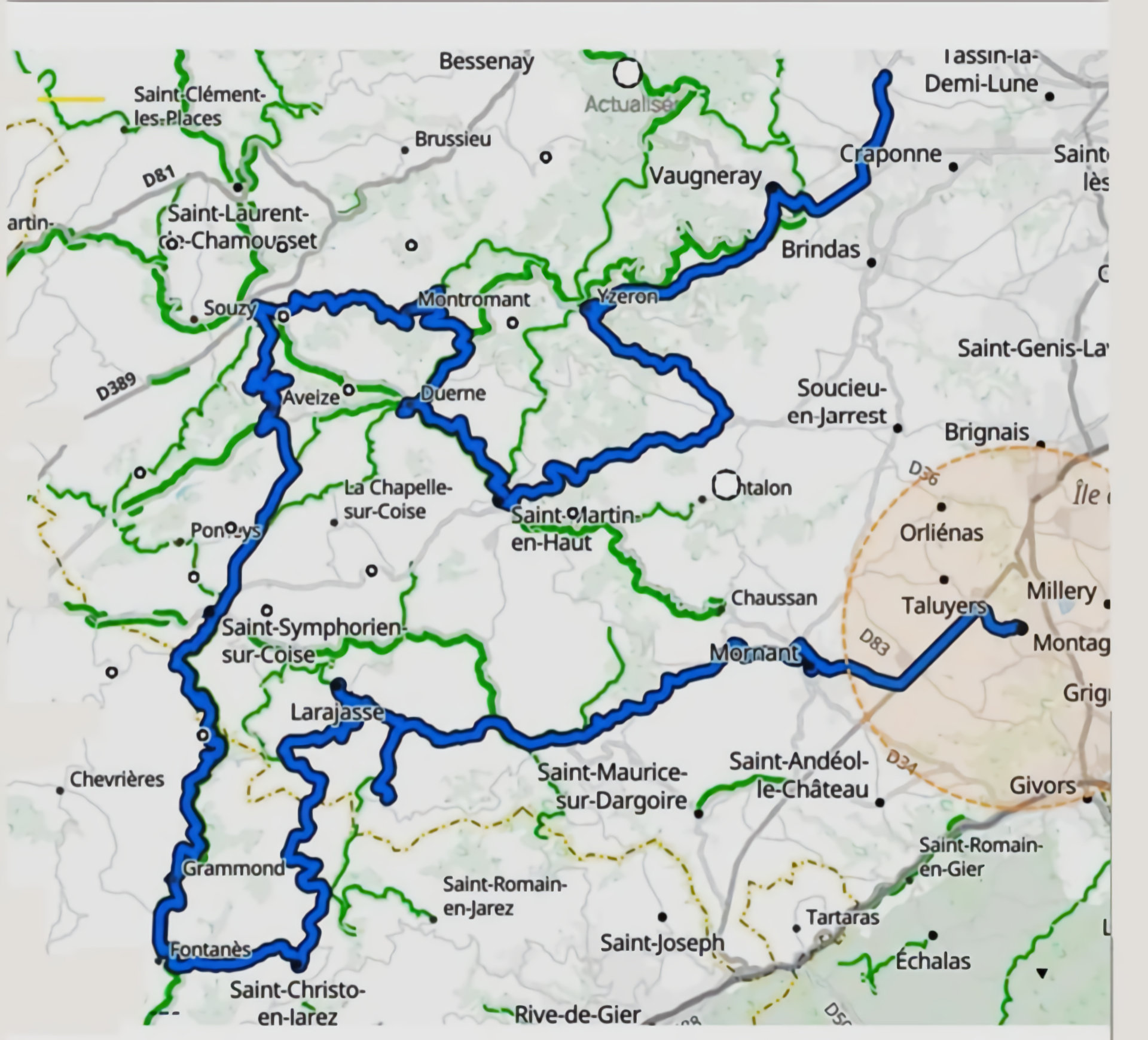 Ensuite nous reprenons la route vers Ste-Foy-l ’Argentière, St-Symphorien-sur-Coise, St-Christo-en-Jarez, l’Aubépin, Ste-Catherine, Riverie, Mornant, St-Laurent-d’Agny, Taluyers et Montagny.