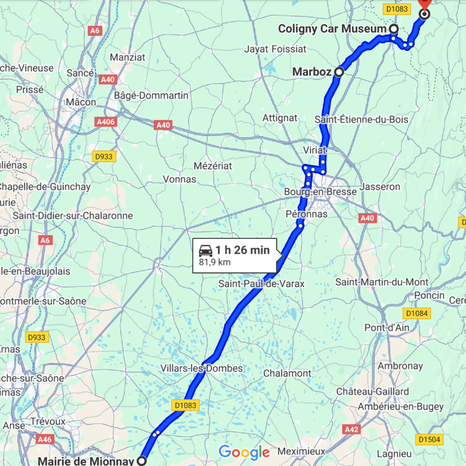 Après un café au départ de Mionnay, nous prenons la route en direction de Bourg-en-Bresse, en traversant les paysages paisibles des Dombes et leurs nombreux étangs. Après avoir parcouru de longues lignes droites et un détour par Marboz, nous abordons quelques virages en direction de Coligny, situé à l’extrémité du département de l’Ain.